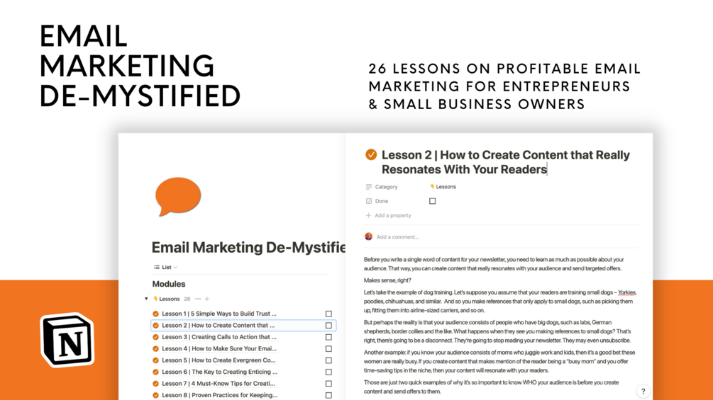 1. What is Email Marketing De-Mystified? This is a Notion-based guide that provides actionable recommendations and best practices to help you build an email list and profit from it in your business.