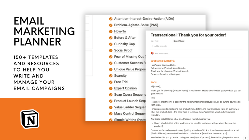 You are purchasing a Notion-based training and workspace built to help you to plan and build your email campaigns and create a meaningful and profitable relationship with your subscribers. You get a full collection of proven formulas and done-for-you templates as well as a simple planning system to draft and edit your emails.